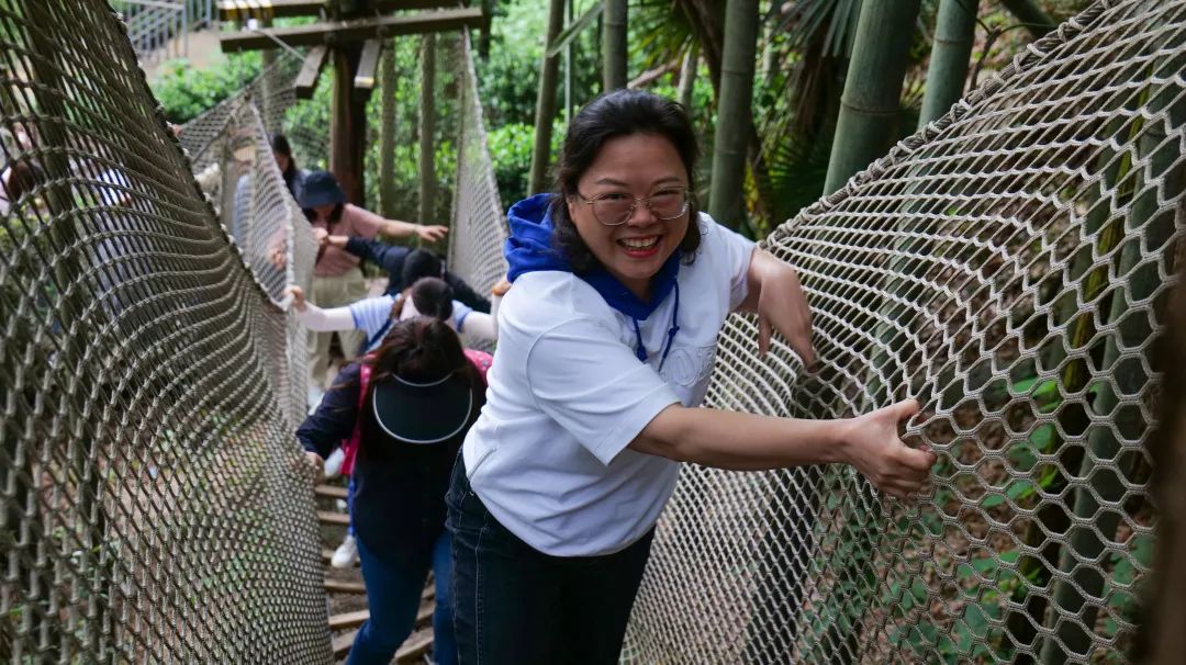 团建活动从爬山徒步开始,大家精神抖擞,迈着轻快的步伐边走边欣赏着大自然的美丽景色,一路欢声笑语,你追我赶、尽情释怀,深深感受到集体活动的力量和徒步运动的魅力。活动中的“丛林穿越”拓展项目是集冒险、运动、挑战于一体的户外运动项目,整个运动中,汇集了高空、胆量、速度、毅力等元素,不仅提供了感官上的刺激,同时也让大家在欢乐的气氛中锻炼了毅力,增强了克服困难、挑战自我的勇气与信心。在核心景区天空之镜,大家在高空玻璃光景台上360度欣赏仙岛湖美景,陶醉在大自然的秀美风光之中,露出了灿烂的笑脸。